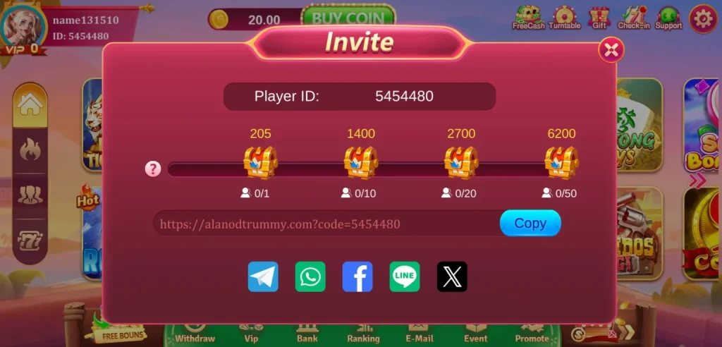 After inviting, one person will earn 205 PKR. If you invite 10 users, you will earn 1400 PKR. Moreover, 20 players on this platform can earn 2700 PKR. However, invite 50 people and earn 6200 PKR. So, keep inviting more people to boost rewards daily.